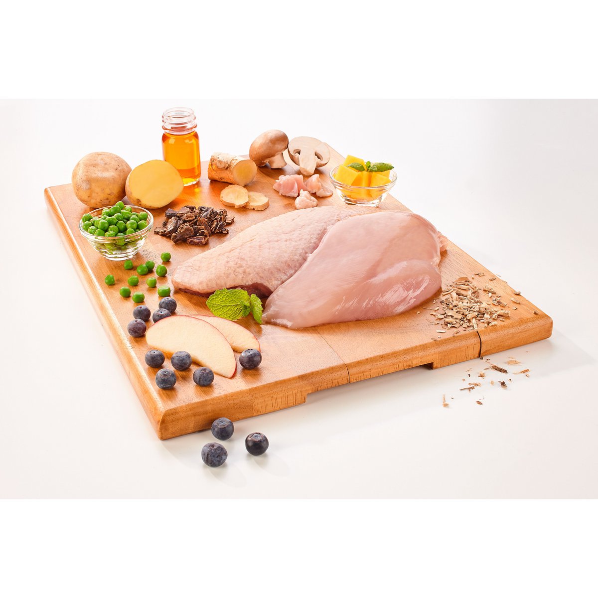 Geflügel 75% (dehydriertes Hühnerprotein 35%, Hühnerfleisch** 20%, Ente** 20%), geschälte Erbsen* 22,5%, Kartoffelstärke 21%, Geflügelfett 4,5%, Rübenschnitzel 4,5%, Lignocelullose 3%, Pilze* 1 %, Heidelbeeren* 1 %, Mango* 1 %, Apfel* 1 %, Lachsöl 0,5 %, Mineralstoffe, Malzextrakt, Johannisbrot*, Yucca-Extrakt (Yucca Schidigera), Glucosamin-Hydrochlorid, Chondroitinsulfat, Methylsulfonyl-Methan , Zichorienwurzel (enthält Inulin und Fructo-Oligosaccharide), Hefe (Mannan-Oligosaccharide), Ingwer*, Brennesseln*.