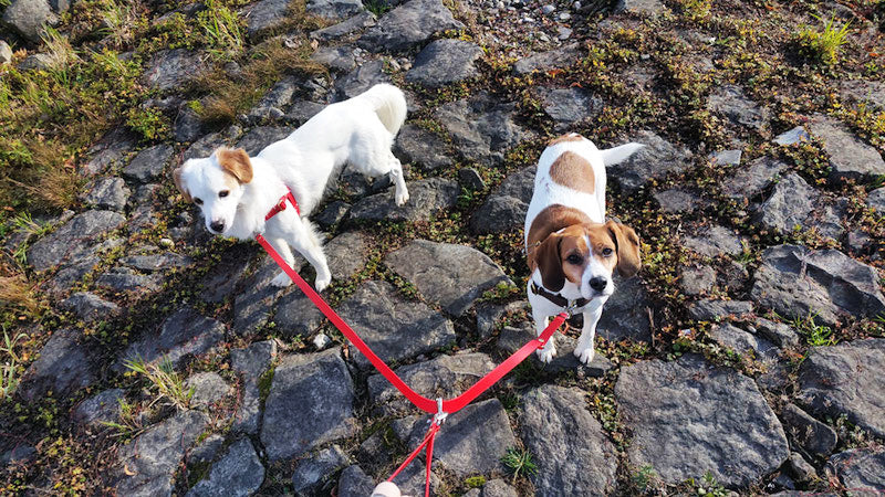 Das Führen von zwei Hunden gestaltet sich besonders komfortabel mit unserer Techtelmechtel Leine für zwei. Ausgestattet mit einem Handgriff, der mittels Edelstahlring an der Leine entlang läuft, drehen sich beide Leinenseiten mit.