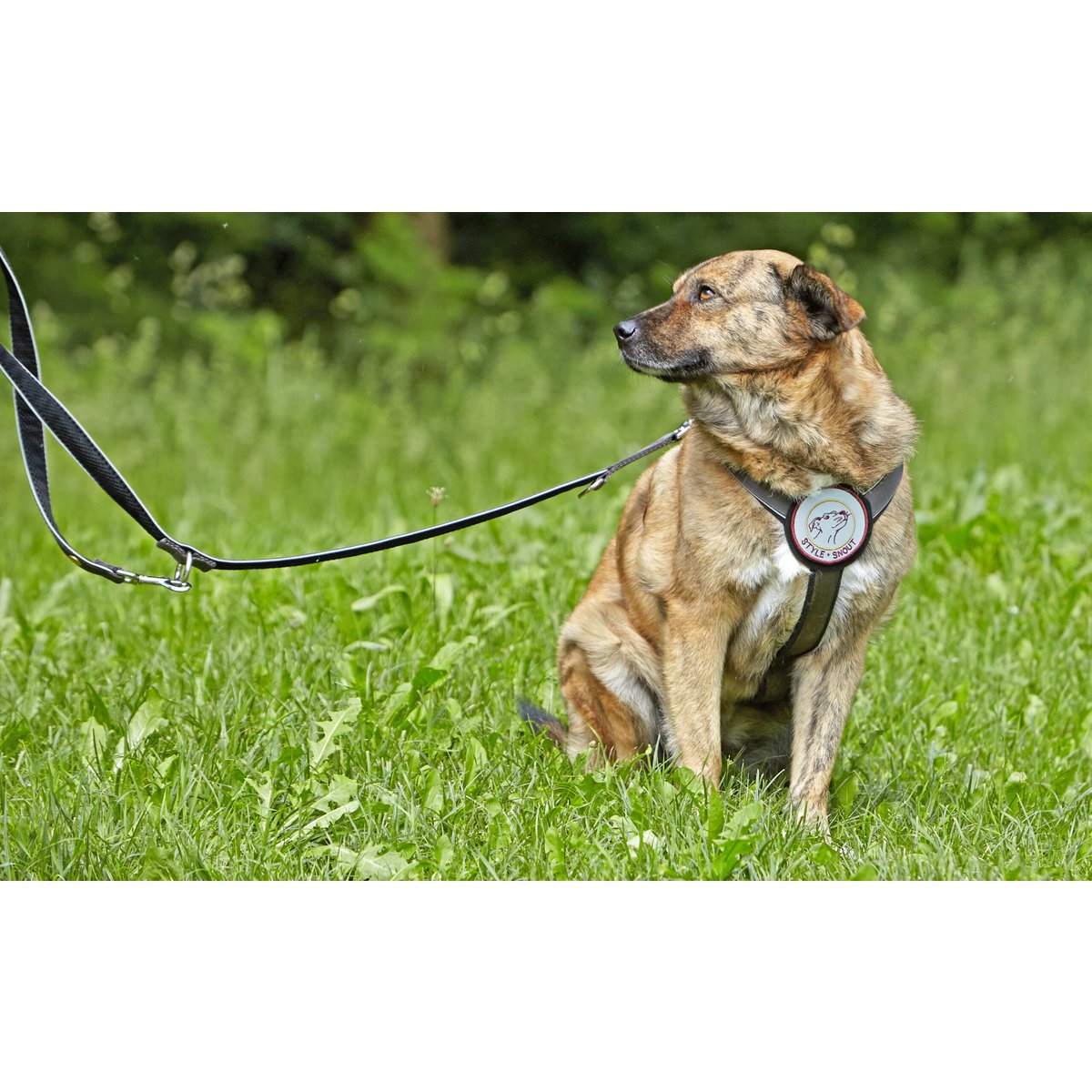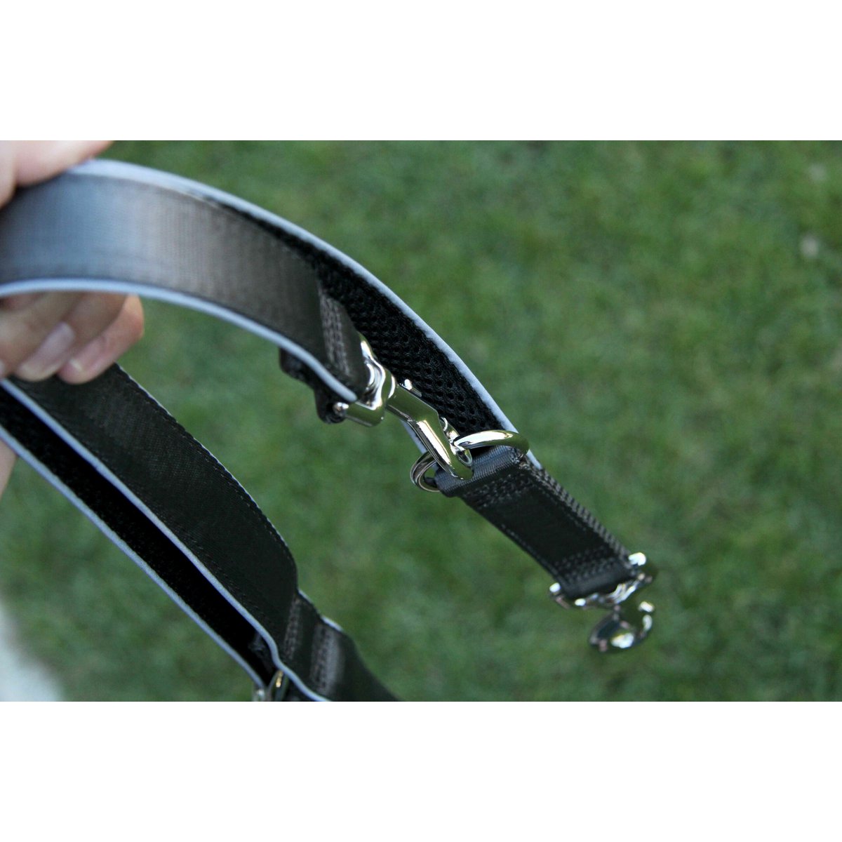 Die Hundeleine der StyleSnout®-Edition besteht aus stabilem Gurtband mit einer starken Zugkraft. Mit der glatten Oberflächenstruktur liegt sie zudem sehr angenehm in der Hand und wirkt in der Farbkombination Silver-Black elegant-sportlich. Die weiche Air-Mesh-Polsterung auf der Rückseite der Leine sorgt für eine gute Führung und Rutschfestigkeit. Bessere Sichtbarkeit in der Dunkelheit garantiert außerdem der reflektierende Außenrand der Leine. Die Führleine ist dreifach verstellbar und kommt in der L-Version mit größeren Karabinern als bei der M-Größe, einem breiteren Gurtband (2,5cm) und massiven O-Ringen, für eine stärkere Zugkraft besonders für große Hunde, oder für alle, die eine robustere Leine bevorzugen. Die O-Ringe sind verschweißt. Die Original StyleSnout®-Führleine erkennt man an der goldenen Designed FOR STYLE DOGS Niete. Feinwaschgang bei maximal 30 Grad möglich. Nicht für den Trockner geeignet. Größe L: 200 cm Länge x 25 mm Breite Gurtband Größe M: 200 cm Länge x 20 mm Breite Gurtband