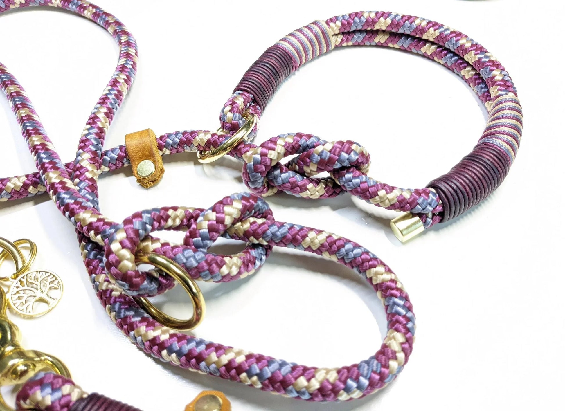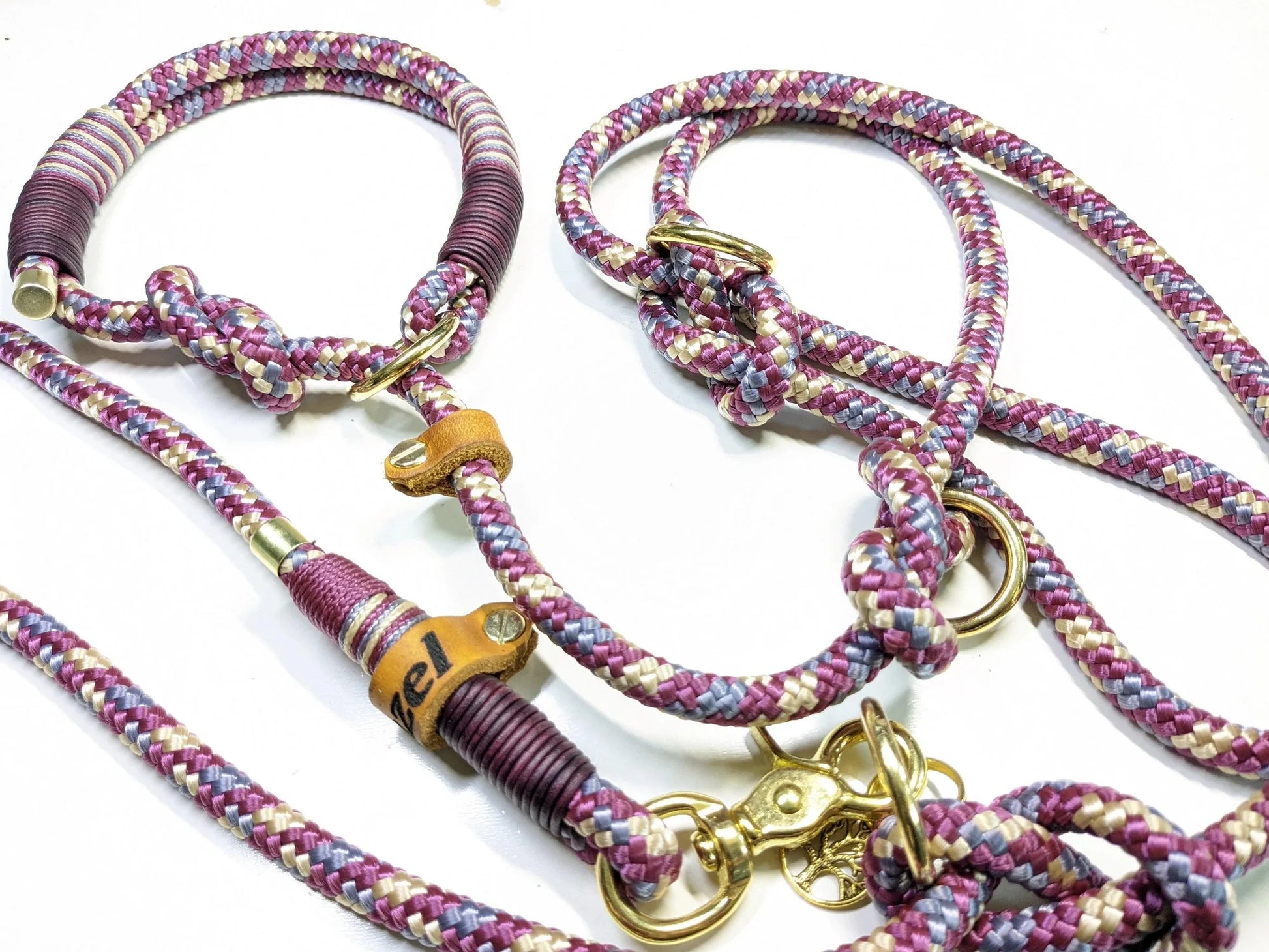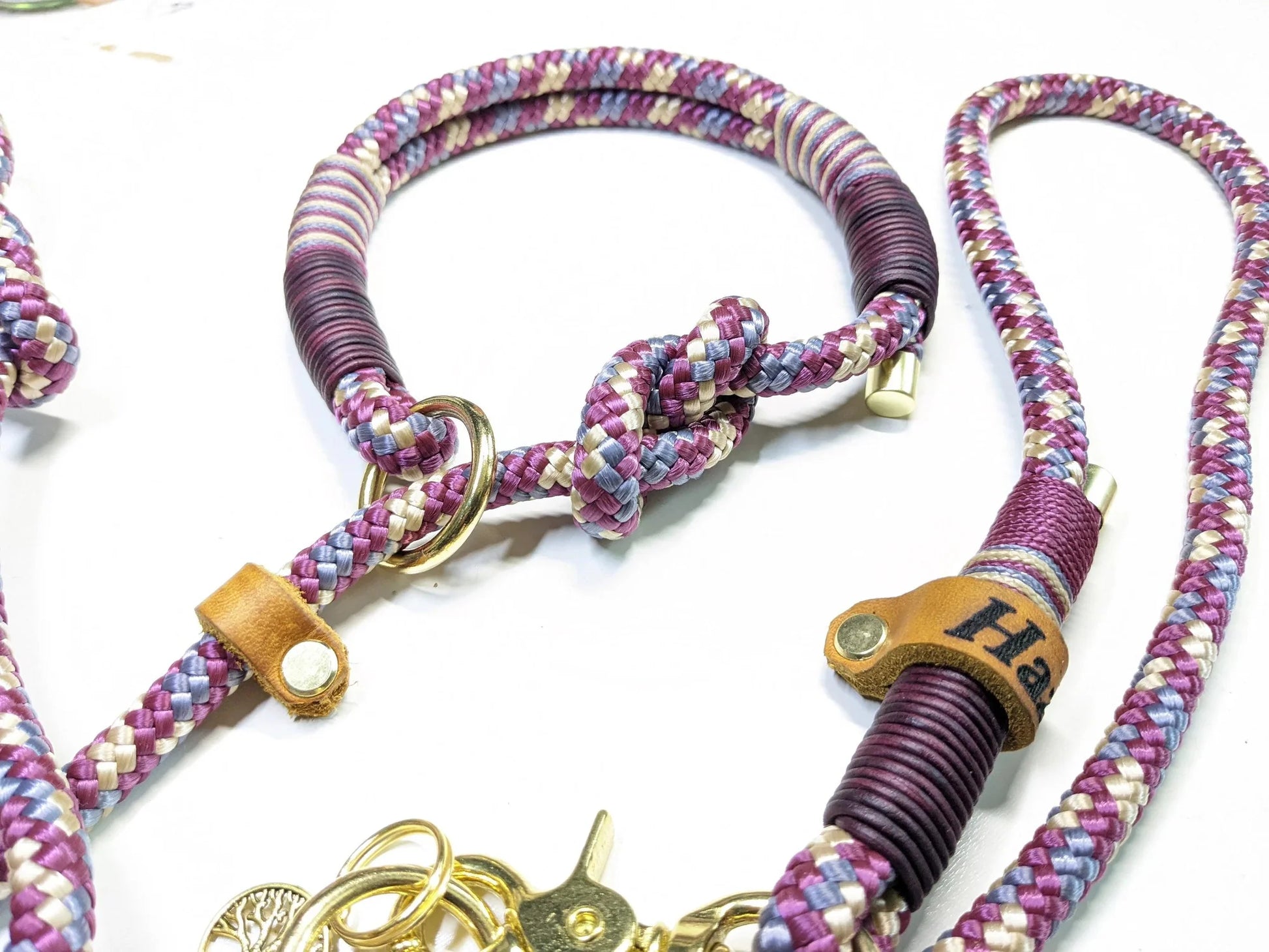 Die Leine ist aus PPM in lila/beige/grau und bordeauxrotem Vintageleder getakelt und 2-fach verstellbar. Ringe sind durch Achterknoten individuell verstellbar.