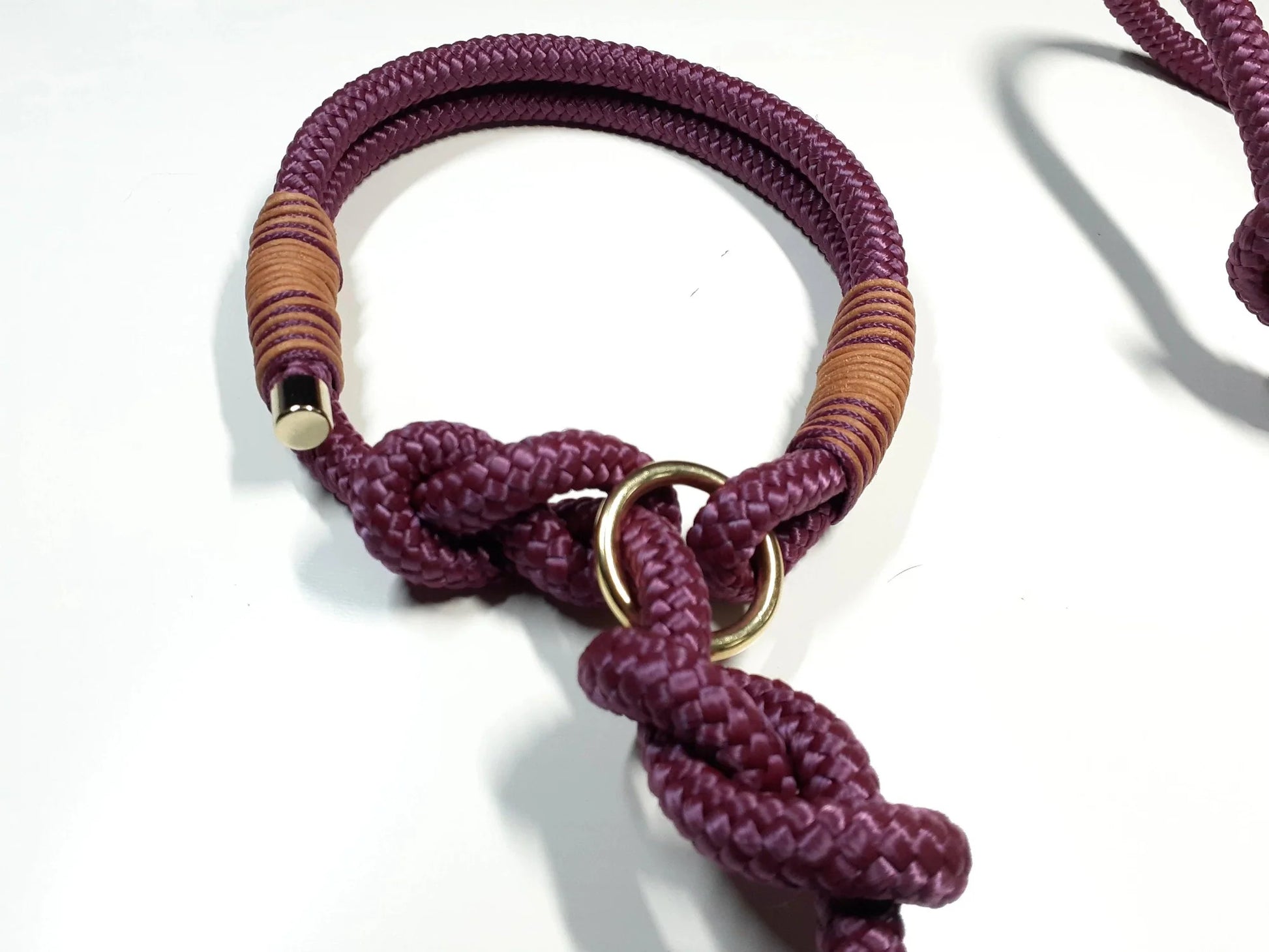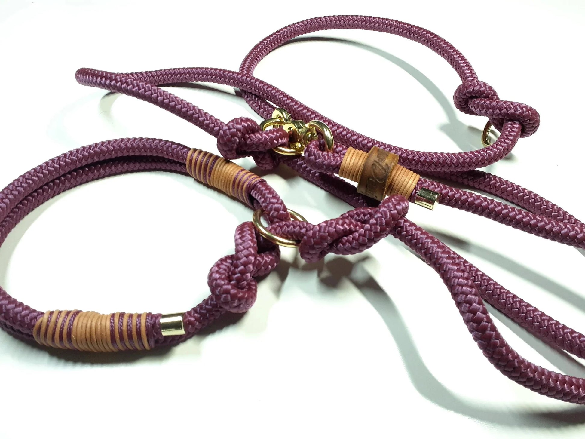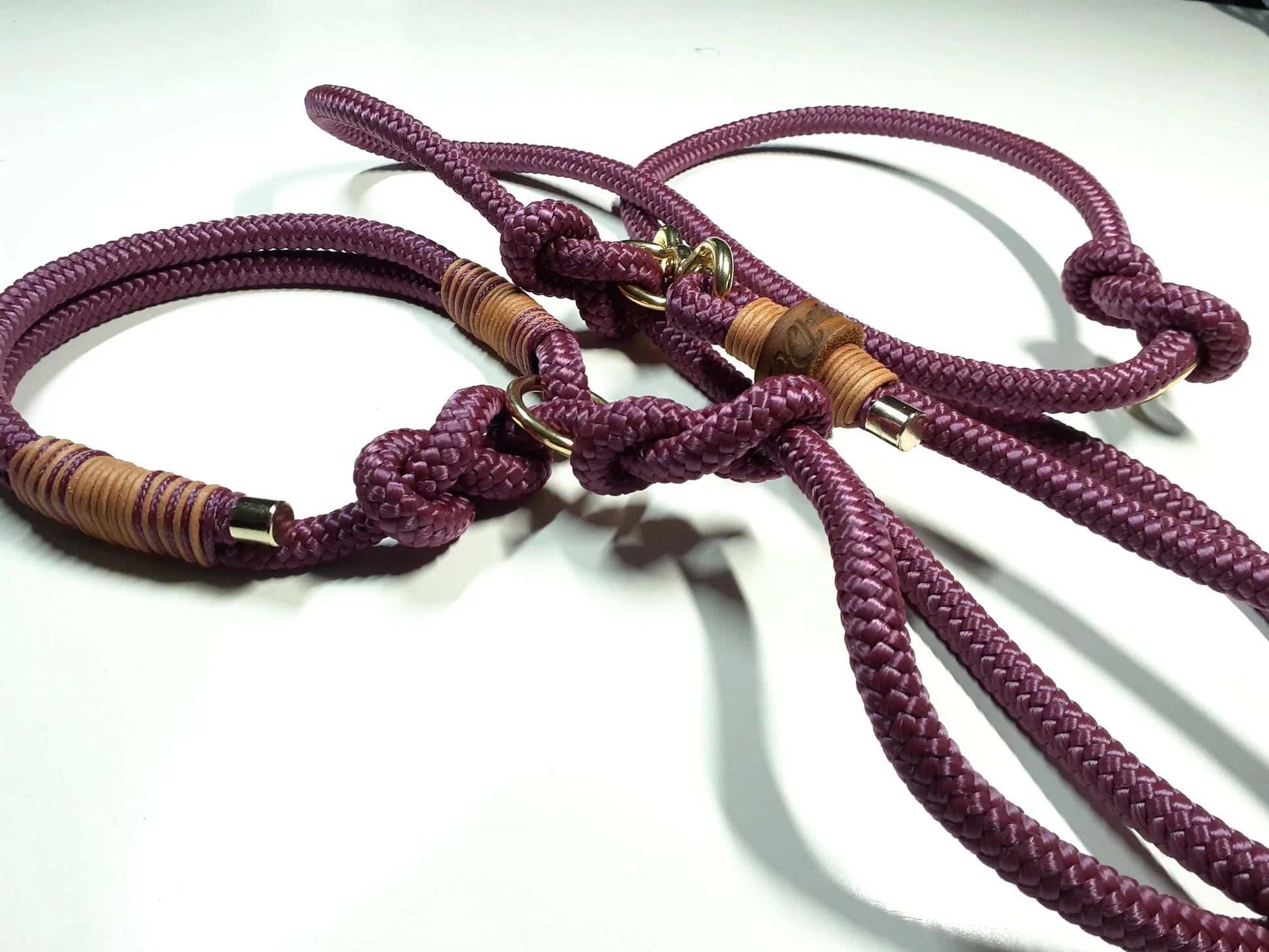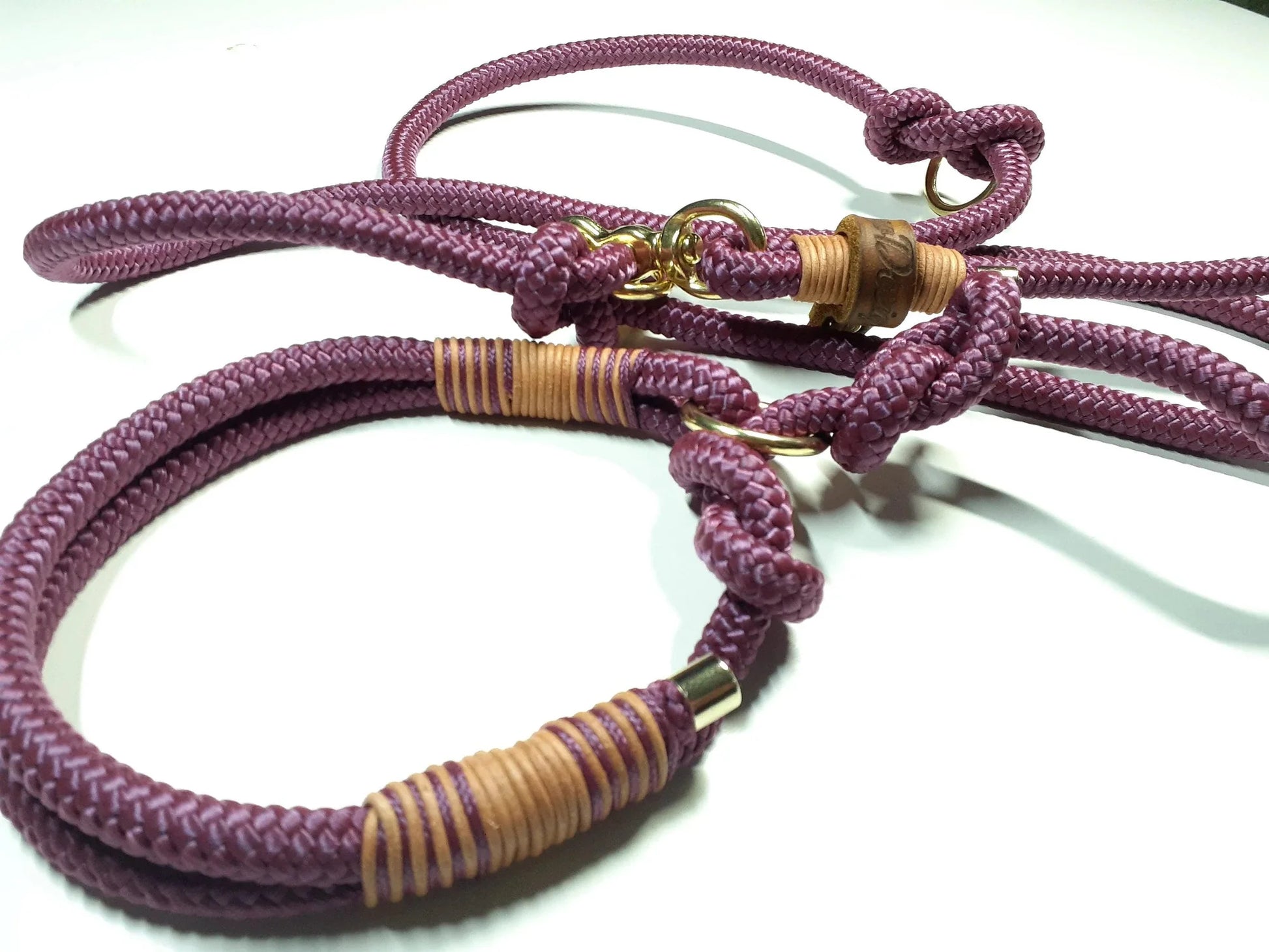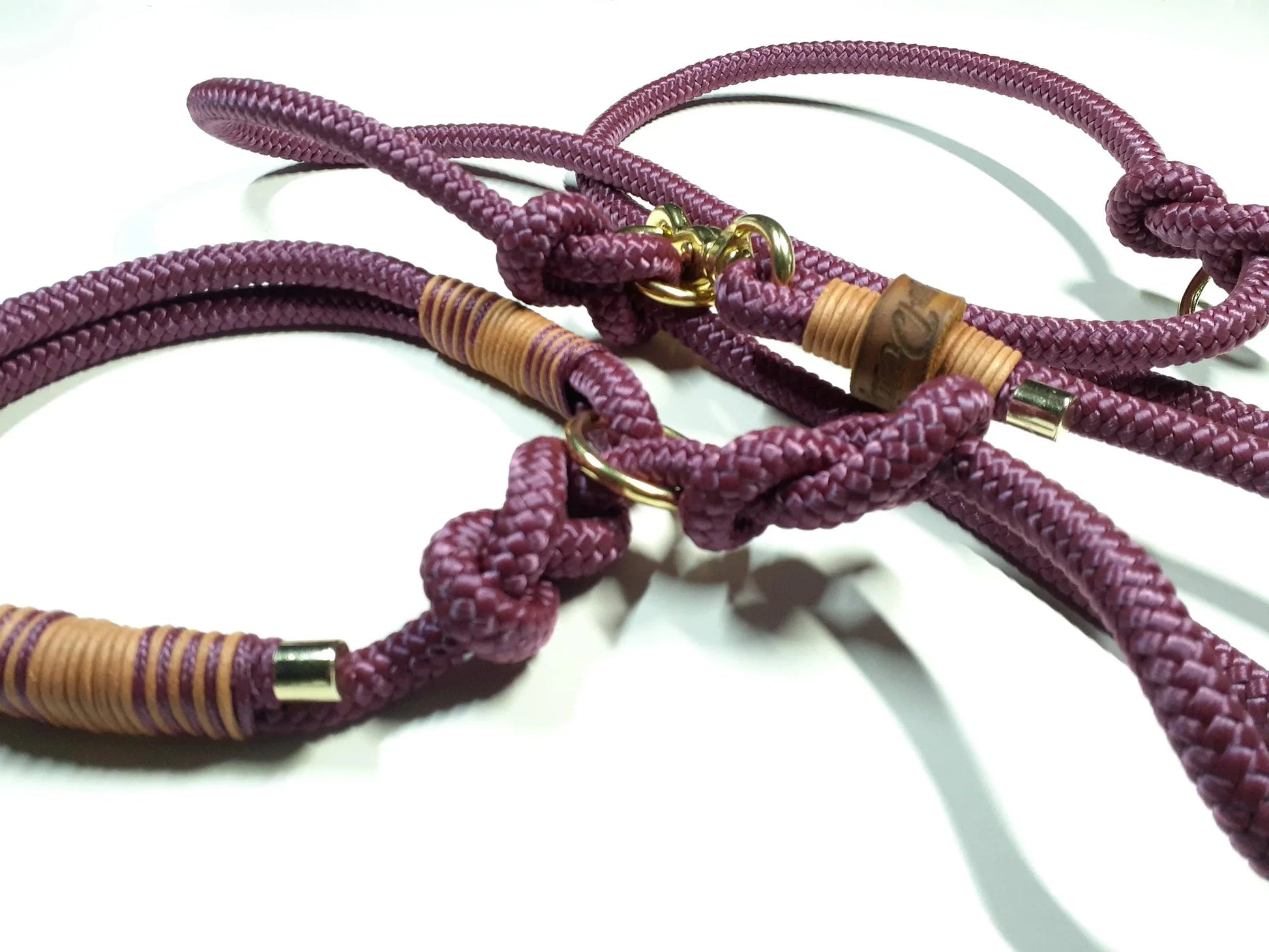 Die Leine ist aus PPM in lila/beige/grau und bordeauxrotem Vintageleder getakelt und 2-fach verstellbar. Ringe sind durch Achterknoten individuell verstellbar.