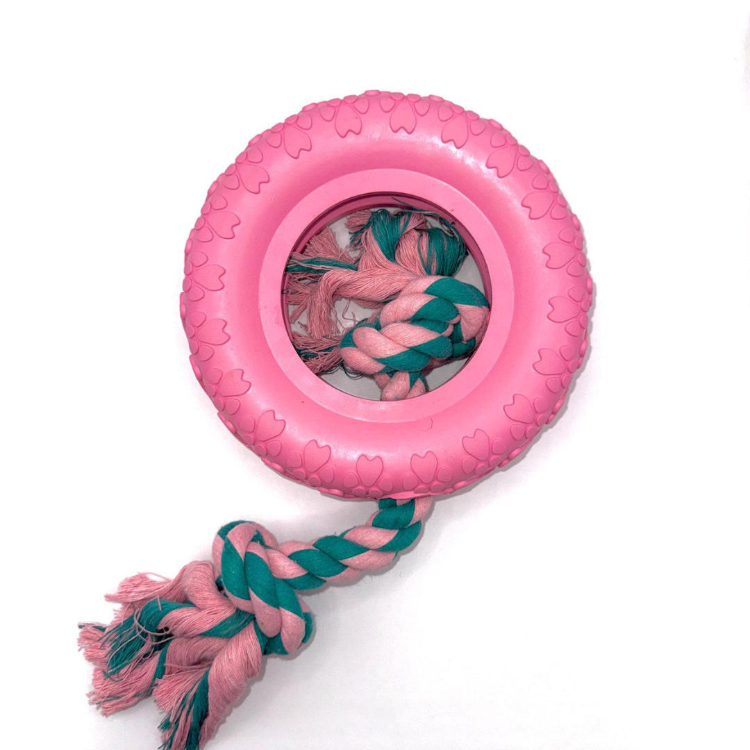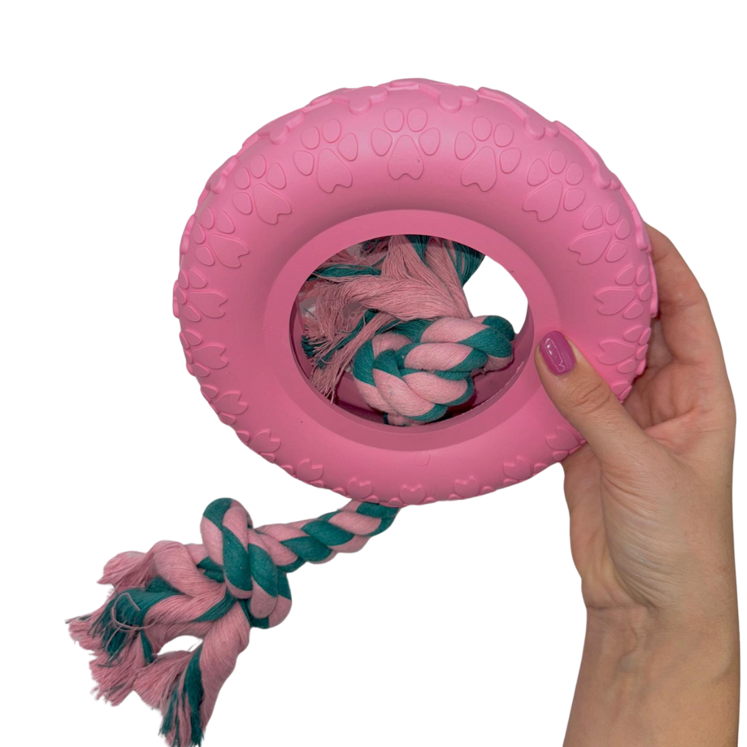 🐾 Vielseitige Farben und Größen – Der Kauring ist in den Farben Türkis und Lila (Größe M) sowie in Rosa mit Seil (Größe L) erhältlich, perfekt für unterschiedliche Vorlieben und Spielbedürfnisse.
