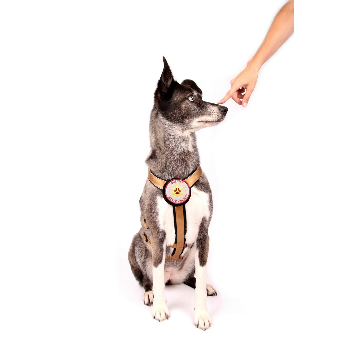 Speziell für ängstliche und unsichere Hunde oder neue Situationen, wie z.B. die Fahrt in der U-Bahn oder der Spaziergang an großen Straßen, hat StyleSnout® ein passendes Hundegeschirr entwickelt. Die Linie Patch&Safe steht für ein modernes Sicherheitsgeschirr, das den Hund optimal absichert, im Dunkeln reflektiert und mit witzigen Sprüchen auf der Brust für Aufsehen sorgt. Denn die „Statement-Patches“ können mit Hilfe eines Klettverschlusses vorne auf der Brustplatte je nach Lust und Laune ausgetauscht werden. Ganz nach Tagesform oder für bestimmte Anlässe. Zusätzlich reflektieren die Geschirre – sowie auch die komplette Fläche des Stickers – das Licht und dienen so als Schutz in der Dämmerung oder Dunkelheit, da der Hund nicht mehr übersehen werden kann. Die Patches gibt es einzeln zu kaufen und werden mit Sicherheit beim Gassigehen für das eine oder andere Schmunzeln sorgen. Die Patch&Safe-Sicherheitsgeschirre sind verstellbar, aus hochwertigem Gurtband genäht und aufwendig verarbeitet. Für die Polsterung sind sie mit weichem Air Mesh unterlegt. Der zweite Bauchgurt in der Taille macht das Hundegeschirr absolut ausbruchsicher: Der Hund kann sich nicht aus dem Geschirr befreien. Da Hunde keine Schultergelenke haben, können sie sich aus jedem normalen Brust-Geschirr rauswinden, indem sie die Beine nach vorne strecken und rückwärts gehen. Größe XXS XS S M L XL Gewicht von 3,5kg 6kg 11kg 18kg 26kg 35kg Gewicht bis 5,5kg 11kg 18kg 26kg 35kg 50kg Schulterhöhe bis ca. 28cm bis ca. 38cm bis ca. 50cm bis ca. 60cm bis 65cm über 65cm Feinwaschgang bei maximal 30 Grad möglich. Nicht für den Trockner geeignet. Größe XXS Gurtbandbreite 15mm, schwarze Plastikschließen Halsumfang ca. 30cm-38cm Rückensteg ca. 12,50cm Bauchsteg ca. 21cm (inkl. Brustplatte) Brustumfang 30cm bis max. 54cm Taillenumfang 30cm bis max. 54cm Durchmesser Brustplatte 7cm Größe XS Gurtbandbreite 15mm, schwarze Plastikschließen Halsumfang ca. 31cm-39cm Rückensteg ca. 20cm Bauchsteg ca. 25cm (inkl. Brustplatte) Brustumfang 32cm bis max. 52cm Taillenumfang 32cm bis max. 52cm Durchmesser Brustplatte 7cm Größe S Gurtbandbreite 20mm, schwarze Plastikschließen Halsumfang ca. 40cm-48cm Rückensteg ca. 21cm Bauchsteg ca. 31cm (inkl. Brustplatte) Brustumfang 36cm bis max. 72cm Taillenumfang 36cm bis max. 72cm Durchmesser Brustplatte 7cm Größe M Gurtbandbreite 25mm, schwarze Plastikschließen Halsumfang ca. 46cm-58cm Rückensteg ca. 25cm Bauchsteg ca. 35cm (inkl. Brustplatte) Brustumfang 51cm bis max. 82cm Taillenumfang 47cm bis max. 73cm Durchmesser Brustplatte 9cm Größe L Gurtbandbreite 25mm, schwarze Plastikschließen Halsumfang ca. 52cm-65cm Rückensteg ca. 26cm Bauchsteg ca. 37cm (inkl. Brustplatte) Brustumfang 49cm bis max. 91cm Taillenumfang 51cm bis max. 81cm Durchmesser Brustplatte 9cm Größe XL Gurtbandbreite 25mm, schwarze Plastikschließen Halsumfang ca. 63cm-76cm Rückensteg ca. 31cm Bauchsteg ca. 46cm (inkl. Brustplatte) Brustumfang 56cm bis max. 110cm Taillenumfang 54cm bis max. 106cm Durchmesser Brustplatte 9cm