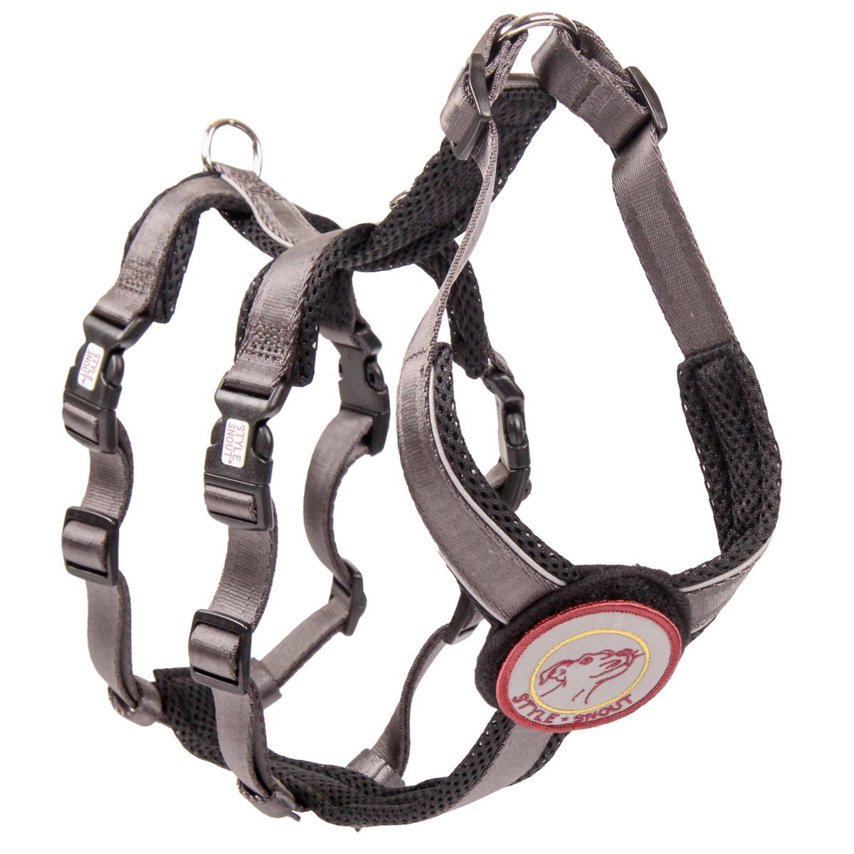 Speziell für ängstliche und unsichere Hunde oder neue Situationen, wie z.B. die Fahrt in der U-Bahn oder der Spaziergang an großen Straßen, hat StyleSnout® ein passendes Hundegeschirr entwickelt. Die Linie Patch&Safe steht für ein modernes Sicherheitsgeschirr, das den Hund optimal absichert, im Dunkeln reflektiert und mit witzigen Sprüchen auf der Brust für Aufsehen sorgt. Denn die „Statement-Patches“ können mit Hilfe eines Klettverschlusses vorne auf der Brustplatte je nach Lust und Laune ausgetauscht werden. Ganz nach Tagesform oder für bestimmte Anlässe. Zusätzlich reflektieren die Geschirre – sowie auch die komplette Fläche des Stickers – das Licht und dienen so als Schutz in der Dämmerung oder Dunkelheit, da der Hund nicht mehr übersehen werden kann. Die Patches gibt es einzeln zu kaufen und werden mit Sicherheit beim Gassigehen für das eine oder andere Schmunzeln sorgen. Die Patch&Safe-Sicherheitsgeschirre sind verstellbar, aus hochwertigem Gurtband genäht und aufwendig verarbeitet. Für die Polsterung sind sie mit weichem Air Mesh unterlegt. Der zweite Bauchgurt in der Taille macht das Hundegeschirr absolut ausbruchsicher: Der Hund kann sich nicht aus dem Geschirr befreien. Da Hunde keine Schultergelenke haben, können sie sich aus jedem normalen Brust-Geschirr rauswinden, indem sie die Beine nach vorne strecken und rückwärts gehen. Größe XXS XS S M L XL Gewicht von 3,5kg 6kg 11kg 18kg 26kg 35kg Gewicht bis 5,5kg 11kg 18kg 26kg 35kg 50kg Schulterhöhe bis ca. 28cm bis ca. 38cm bis ca. 50cm bis ca. 60cm bis 65cm über 65cm Feinwaschgang bei maximal 30 Grad möglich. Nicht für den Trockner geeignet. Größe XXS Gurtbandbreite 15mm, schwarze Plastikschließen Halsumfang ca. 30cm-38cm Rückensteg ca. 12,50cm Bauchsteg ca. 21cm (inkl. Brustplatte) Brustumfang 30cm bis max. 54cm Taillenumfang 30cm bis max. 54cm Durchmesser Brustplatte 7cm Größe XS Gurtbandbreite 15mm, schwarze Plastikschließen Halsumfang ca. 31cm-39cm Rückensteg ca. 20cm Bauchsteg ca. 25cm (inkl. Brustplatte) Brustumfang 32cm bis max. 52cm Taillenumfang 32cm bis max. 52cm Durchmesser Brustplatte 7cm Größe S Gurtbandbreite 20mm, schwarze Plastikschließen Halsumfang ca. 40cm-48cm Rückensteg ca. 21cm Bauchsteg ca. 31cm (inkl. Brustplatte) Brustumfang 36cm bis max. 72cm Taillenumfang 36cm bis max. 72cm Durchmesser Brustplatte 7cm Größe M Gurtbandbreite 25mm, schwarze Plastikschließen Halsumfang ca. 46cm-58cm Rückensteg ca. 25cm Bauchsteg ca. 35cm (inkl. Brustplatte) Brustumfang 51cm bis max. 82cm Taillenumfang 47cm bis max. 73cm Durchmesser Brustplatte 9cm Größe L Gurtbandbreite 25mm, schwarze Plastikschließen Halsumfang ca. 52cm-65cm Rückensteg ca. 26cm Bauchsteg ca. 37cm (inkl. Brustplatte) Brustumfang 49cm bis max. 91cm Taillenumfang 51cm bis max. 81cm Durchmesser Brustplatte 9cm Größe XL Gurtbandbreite 25mm, schwarze Plastikschließen Halsumfang ca. 63cm-76cm Rückensteg ca. 31cm Bauchsteg ca. 46cm (inkl. Brustplatte) Brustumfang 56cm bis max. 110cm Taillenumfang 54cm bis max. 106cm Durchmesser Brustplatte 9cm